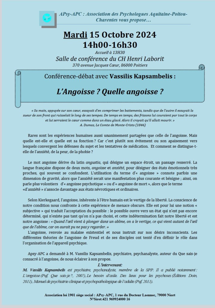 - 15 octobre 2024: L’ Angoisse ? Quelle Angoisse Monsieur Vassilis Kapsembelis, psychiatre, psychanalyste, membre de la SPP